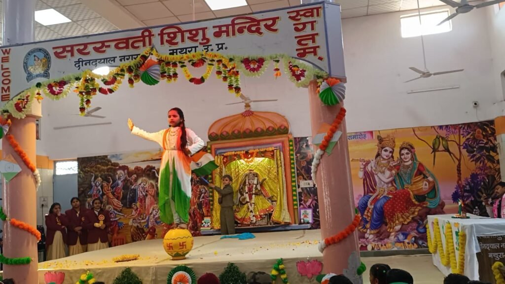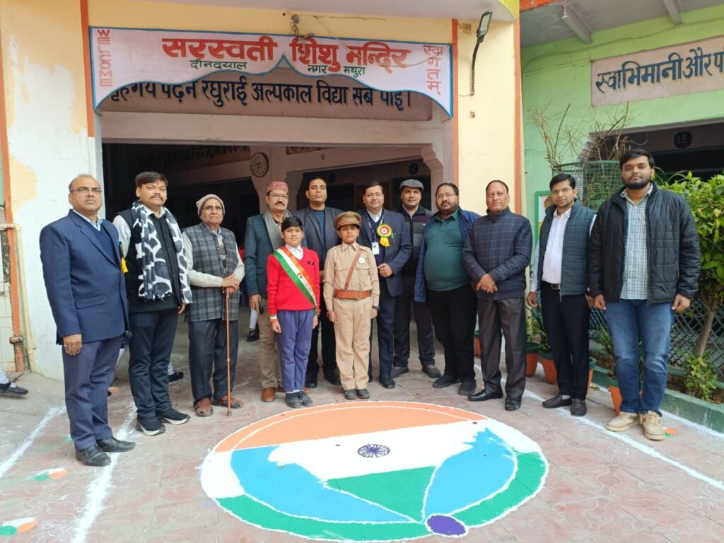 मथुरा। डेंपियर नगर स्थित सरस्वती शिशु मंदिर में 77वां गणतंत्र दिवस समारोह अत्यंत ही गरिमामयी एवं राष्ट्रभक्ति के वातावरण में मनाया गया। कार्यक्रम का शुभारंभ मुख्य अतिथि भुवन भूषण कमल (सदस्य, राष्ट्रीय पिछड़ा वर्ग आयोग) द्वारा ध्वजारोहण कर किया गया। इसके पश्चात राष्ट्रगान का सामूहिक गायन हुआ।