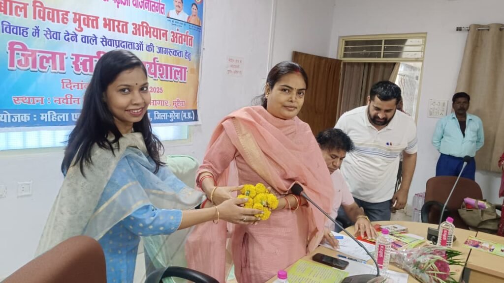 मुरैना/मप्र। बाल विवाह लड़के-लड़कियों का बचपन और भविष्य छीन लेता है। यह एक सामाजिक कुरीति ही नहीं, बल्कि समुदाय और समाज के विकास ने भी बाधक है। इसलिए इस बुराई को बालिका शिक्षा और जनजागरूकता से ही खत्म किया जा सकता है। उक्त विचार जिला पंचायत अध्यक्ष श्रीमती आरती आकाश गुर्जर ने बेटी बचाओ बेटी पढाओ एवं बाल विवाह मुक्त भारत अभियान के अन्तर्गत विवाह में सेवा देने वाले सेवाप्रदाताओं की जागरुकता हेतु आज जिला पंचायत के सभागार में जिला स्तरीय कार्यशाला में बतौर मुख्य अतिथि बोल रही थीं।