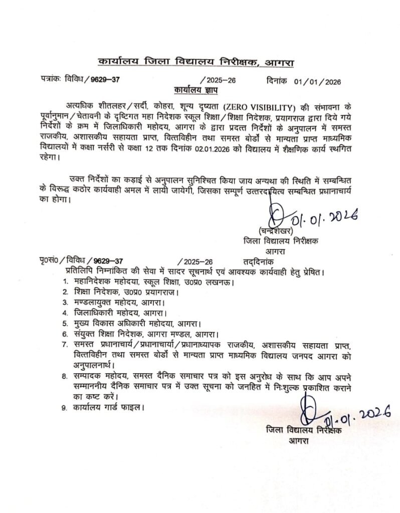 आगरा: उत्तर भारत में कड़ाके की सर्दी और शीतलहर का कहर जारी है। घने कोहरे से दृश्यता शून्य होने और ठिठुरन बढ़ने से जनजीवन प्रभावित है। ऐसे में बच्चों की सेहत को ध्यान में रखते हुए जिलाधिकारी के आदेश पर शिक्षा विभाग ने बड़ा फैसला लिया है – कक्षा नर्सरी से 12वीं तक के सभी स्कूलों में 2 जनवरी (शुक्रवार) को छुट्टी घोषित कर दी गई है।
