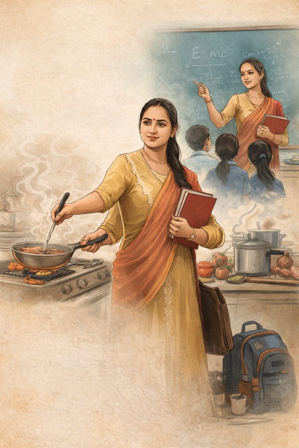 एक महिला शिक्षिका का दिन अलार्म की आवाज़ से नहीं, बल्कि ज़िम्मेदारियों की सूची से शुरू होता है। घर के बाकी सदस्य अभी नींद में होते हैं, तब वह चाय चढ़ा रही होती है, टिफ़िन पैक कर रही होती है, बच्चों को जगा रही होती है और यह सुनिश्चित कर रही होती है कि रसोई में कुछ भी अधूरा न रह जाए। उसके लिए सुबह की तैयारी केवल खुद को तैयार करना नहीं, बल्कि पूरे घर को “चलने लायक” बनाना है। इसके बाद वह अपने पेशेवर चेहरे के साथ घर से निकलती है, लेकिन उसकी चिंताएँ दरवाज़े पर रुकती नहीं हैं। गैस बंद हुई या नहीं, गीजर का स्विच ऑफ है या नहीं—ये सवाल बस या ऑटो की भीड़ में भी उसके साथ चलते हैं।