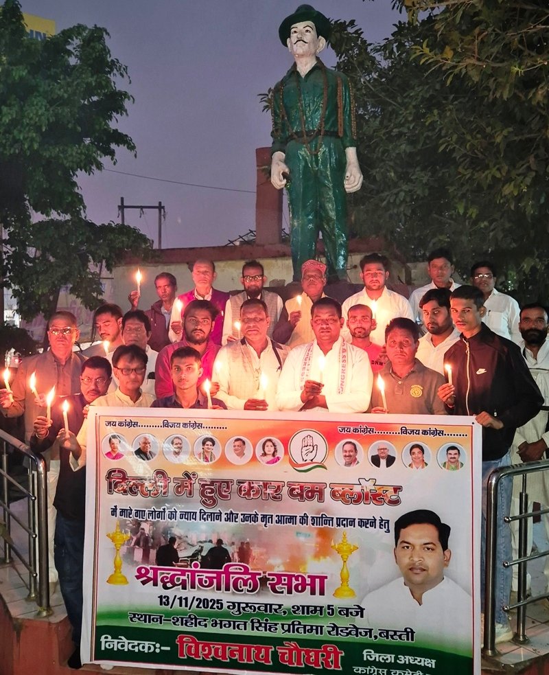 बस्ती। दिल्ली में लाल किला मेट्रो स्टेशन के सामने हुए बम धमाके में मारे गए आम नागरिकों के दिवंगत आत्मा की शांति और आतंकवाद के खात्मे हेतु गुरूवार की शाम को कांग्रेस अध्यक्ष विश्वनाथ चौधरी के नेतृत्व में कैंडल मार्च निकाला गया। रोडवेज तिराहा स्थित शहीदे आजम भगत सिंह प्रतिमा के निकट कैन्डिल मार्च संक्षिप्त सभा के साथ सम्पन्न हुआ। कांग्रेस के अनेक कार्यकर्ता पदाधिकारी एवं आम जनमानस इसमें शामिल हुए। सभी लोगों ने दिवंगत आत्मा की शांति हेतु एक मिनट का मौन रखकर श्रद्धांजलि समर्पित किया। इस दौरान भीड़ ने आतंकवाद मुर्दाबाद और आतंकियों को गिरफ्तार करो के नारे लगाए।