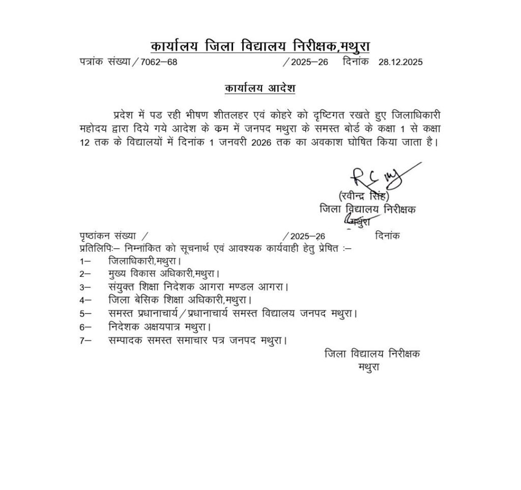 मथुरा। प्रदेश में पड़ रही भीषण शीतलहर और घने कोहरे को देखते हुए जिले में स्कूलों की छुट्टी बढ़ा दी गई है। जिला विद्यालय निरीक्षक मथुरा की ओर से जारी आदेश में बताया गया है कि जिलाधिकारी के निर्देश पर जनपद मथुरा के सभी बोर्डों के कक्षा 1 से कक्षा 12 तक के विद्यालयों में 1 जनवरी 2026 तक अवकाश घोषित किया गया है।