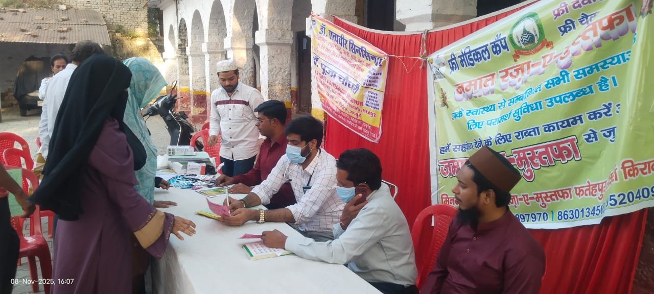 फतेहपुर सीकरी/आगरा: कस्बा फतेहपुर सीकरी में शनिवार को जमात रज़ा ए-मुस्तफ़ा संगठन की ओर से निःशुल्क चिकित्सा शिविर (फ्री मेडिकल कैंप) का आयोजन किया गया। बस स्टैंड के समीप स्थित प्राइमरी स्कूल में दोपहर 1 बजे से शाम 5 बजे तक चले इस कैंप में बड़ी संख्या में मरीजों ने पहुंचकर स्वास्थ्य परीक्षण कराया।
