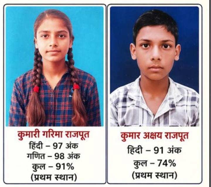 इस अवसर पर विशेष रूप से कुमारी गरिमा राजपूत ने हिंदी विषय में 97 अंक तथा गणित विषय में 98 अंक प्राप्त करते हुए कुल 91% अंक अर्जित कर विद्यालय में प्रथम स्थान हासिल किया है। उनका यह प्रदर्शन अत्यंत सराहनीय है और अन्य विद्यार्थियों के लिए प्रेरणास्रोत है।