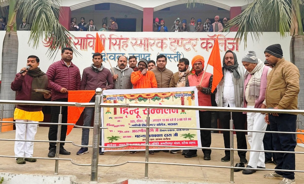 बस्ती। समस्त हिन्दू समाज को संगठित करने तथा सनातन संस्कृति के प्रति जन-जागरूकता फैलाने के उद्देश्य से आगामी रविवार को सावित्री सिंह स्मारक इंटर कॉलेज भदावल के प्रांगण में विराट हिंदू सम्मेलन का आयोजन प्रस्तावित है। कार्यक्रम की सफलता को लेकर शुक्रवार को कार्यक्रम स्थल का भूमि पूजन करने के उपरांत विशाल मोटरसाइकिल जागरूकता रैली निकाली गई। वैदिक मंत्रोच्चार के साथ विधिवत भूमि पूजन सम्पन्न हुआ। आचार्यों द्वारा कराए गए पूजन-अर्चन में उपस्थित श्रद्धालुओं ने सनातन धर्म की एकता, संस्कृति की रक्षा और समाज को संगठित रखने का संकल्प लिया। भूमि पूजन के पश्चात आयोजकों ने आगामी सम्मेलन की तैयारियों को लेकर आवश्यक दिशा-निर्देश भी साझा किए। रैली सावित्री सिंह इंटर कॉलेज से प्रारंभ होकर भदावल, तपसी धाम, जगदीशपुर, तिनौता, ऊभाई, जोगापुर, मिर्जापुर, बनियाजोत, खम्हरिया सुजात से होकर पुनः सावित्री सिंह इंटर कॉलेज पहुंचकर सम्पन्न हुई। रैली में सैकड़ों की संख्या में बाइक सवार युवाओं एवं सनातन बंधुओं ने उत्साहपूर्वक भाग लिया। भगवा ध्वजों से सजी बाइकों और जयघोषों से पूरा क्षेत्र भगवामय हो उठा। रैली के दौरान जय श्रीराम, भारत माता की जय और संगठित हिन्दू – समर्थ भारत के नारों से वातावरण गूंजता रहा। रैली में शामिल लोगों ने पूरे क्षेत्र में लोगों से आगामी रविवार को विराट हिंदू सम्मेलन में बड़ी संख्या में शामिल होने की अपील किया।