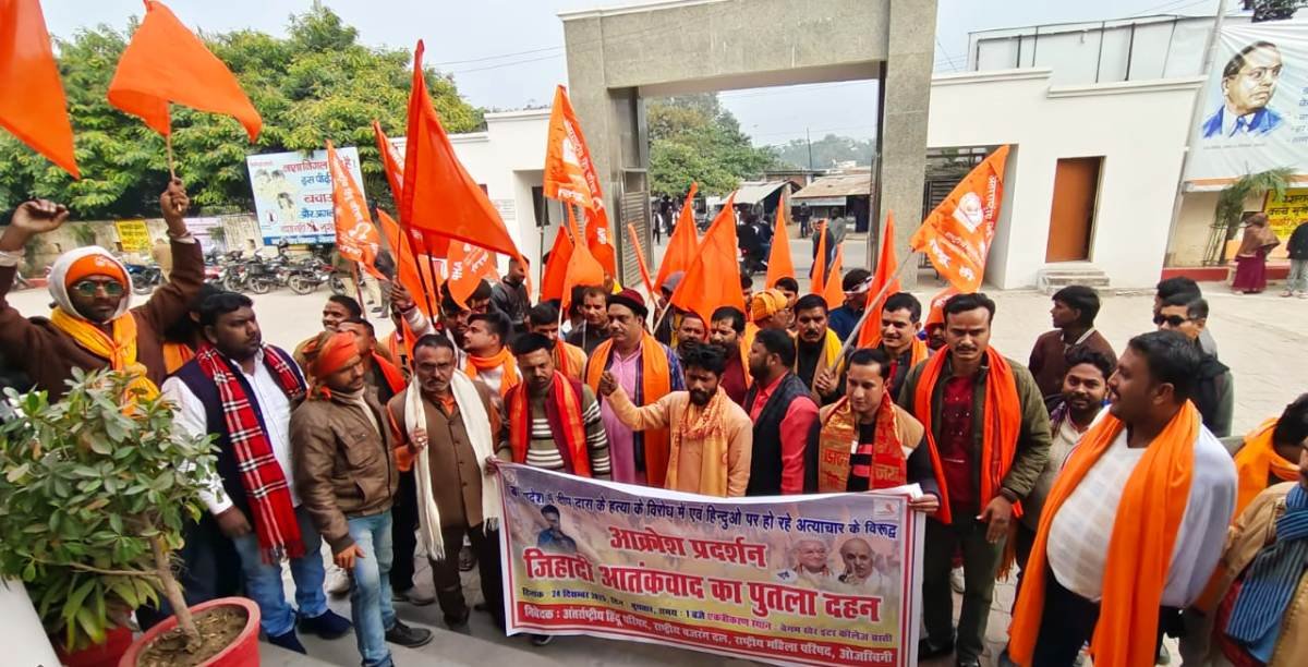 बस्ती । बुधवार को अंतरराष्ट्रीय हिन्दू परिषद जिलाध्यक्ष स्नेह पांडेय एवं राष्ट्रीय बजरंग दल के जिलाध्यक्ष मनमोहन त्रिपाठी के नेतृत्व में पदाधिकारियों ने बांग्लादेश में हिंदू अल्पसंख्यकों के उत्पीड़न, हत्याओं को रोकने के सवाल को लेकर एपीएन पी.जी. कालेज के निकट से जन आक्रोश रैली निकाली। रैली बांग्लादेश विरोधी नारे लगाते हुये लाल बहादुर शास्त्री प्रतिमा के निकट पहुंची जहां बांग्लादेश का पुतला फूंका गया। इसके बाद डीएम कार्यालय पर पदाधिकारियों ने बांग्लादेश के मयमनसिंह के भालुका इलाके में ईशनिंदा के आरोप में 25 वर्षीय फैक्ट्री कर्मचारी दीपू चंद्र दास की पीट-पीटकर हत्या मामले में मृतात्मा के आत्मा की शांति के लिये हनुमान चालीसा का पाठ किया। इसके बाद प्रशासनिक अधिकरी के माध्यम से राष्ट्रपति को ज्ञापन भेजा गया।