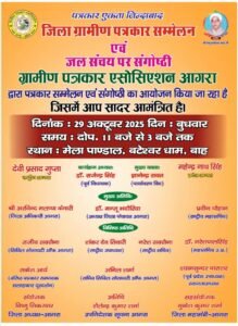 बाह/आगरा। उत्तर भारत के प्रसिद्ध बटेश्वर धाम मेले की पवित्र भूमि आज एक ऐतिहासिक आयोजन की साक्षी बनेगी। जिलापंचायत आगरा एवं ग्रामीण पत्रकार एसोसिएशन (ग्रापए) के संयुक्त तत्वावधान में आज बुधवार 29 अक्टूबर 2025 को एक दिवसीय जिला पत्रकार सम्मेलन एवं जल संचय पर संगोष्ठी का भव्य आयोजन किया जा रहा है।