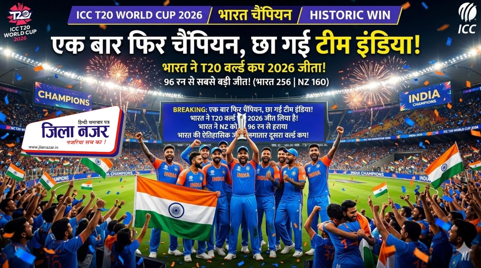 आगरा/ अहमदाबाद । संजू सैमसन और जसप्रीत बुमराह ने भारत को टी ट्वेन्टी विश्व कप क्रिकेट टूर्नामेंट का तीसरी बार खिताब जिताने में मुख्य भूमिका निभाई। रविवार को यहां खेले गए फाइनल में न्यूज़ीलैंड को 96 के बड़े अंतर से हराकर तीसरी बार खिताब पर कब्जा कर लिया। भारतीय टीम ऐसी पहली टीम बन गई है, जिसने तीसरी बार यह कप जीता।
