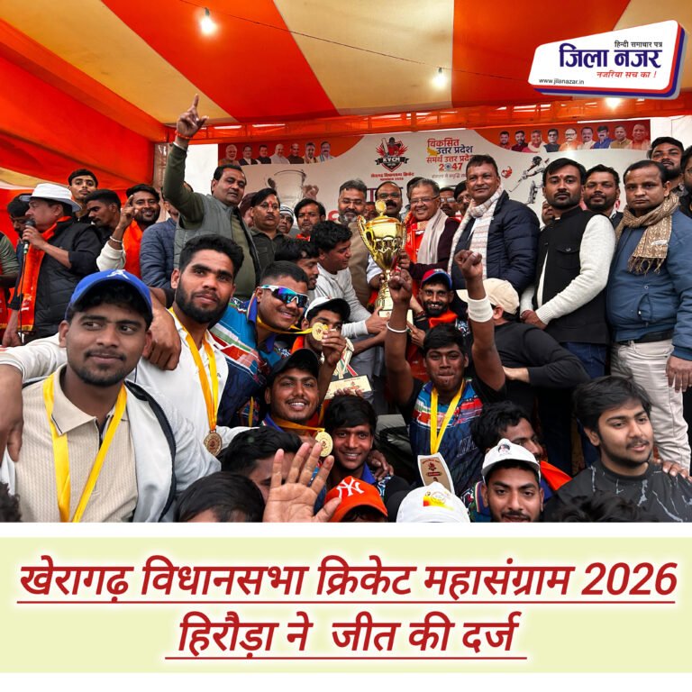 खेरागढ़/आगरा। मंडी समिति ग्राउंड पर आयोजित खेरागढ़ विधानसभा क्रिकेट महासंग्राम 2026 का फाइनल मुकाबला खेल, उत्साह और भव्यता का अद्भुत संगम बन गया। 17वें दिन खेले गए महामुकाबले में हिरौड़ा ग्राम पंचायत की टीम ने अनुशासित प्रदर्शन और बेहतरीन रणनीति के बल पर इरादतनगर न्याय पंचायत को 103 रन के विशाल अंतर से पराजित कर खिताब अपने नाम किया। फाइनल मैच के दौरान मैदान दर्शकों से खचाखच भरा रहा और हर चौके-छक्के पर तालियों की गूंज ने आयोजन की गरिमा को और ऊंचा किया।