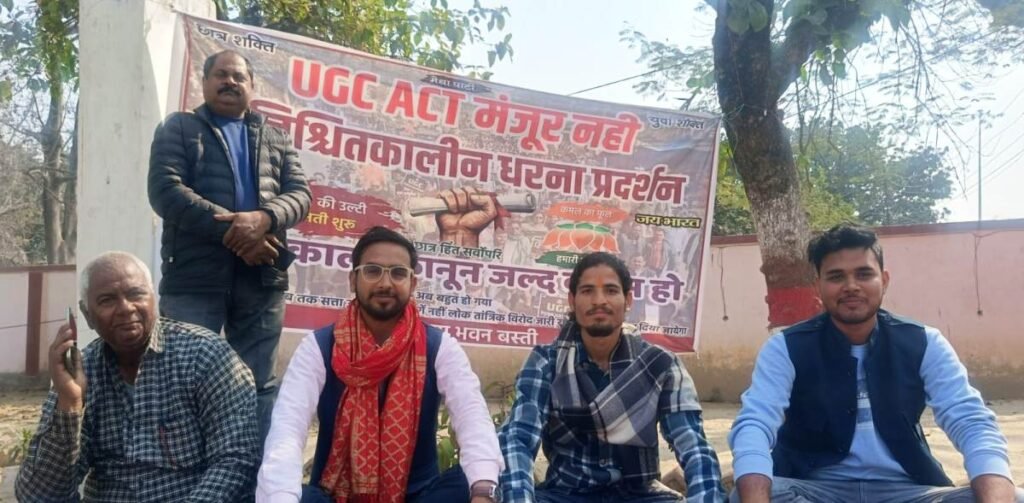 बस्ती। यूजीसी के नये नियमों को वापस लिये जाने की मांग को लेकर सुप्रीम कोर्ट के स्थगन आदेश के बावजूद विरोध प्रदर्शन का सिलसिला जारी है। बुधवार को मेधा पार्टी के राष्ट्रीय प्रवक्ता दीन दयाल त्रिपाठी के नेतृत्व में गांधी कला भवन के स्थित बापू प्रतिमा के निकट अनिश्चितकालीन धरना शुरू किया गया। दीन दयाल त्रिपाठी ने कहा कि जब तक यूजीसी का भेदभाव पैदा करने वाला कानून वापस नहीं लिया जाता मेधा चरणबद्ध आन्दोलन जारी रखेगी।