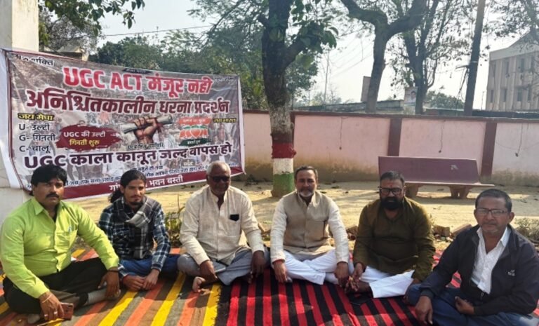 बस्ती। यूजीसी के नये नियमों को वापस लिये जाने की मांग को लेकर मेधा पार्टी के युवा प्रदेश अध्यक्ष रूद्र आदर्श पाण्डेय के नेतृत्व में गांधी कला भवन के स्थित बापू प्रतिमा के निकट अनिश्चितकालीन धरना पिछले 6 दिनों से जारी है। मेधा के राष्ट्रीय प्रवक्ता दीन दयाल त्रिपाठी ने कहा कि जब तक यूजीसी का भेदभाव पैदा करने वाला कानून वापस नहीं लिया जाता मेधा का आन्दोलन जारी रहेगा।