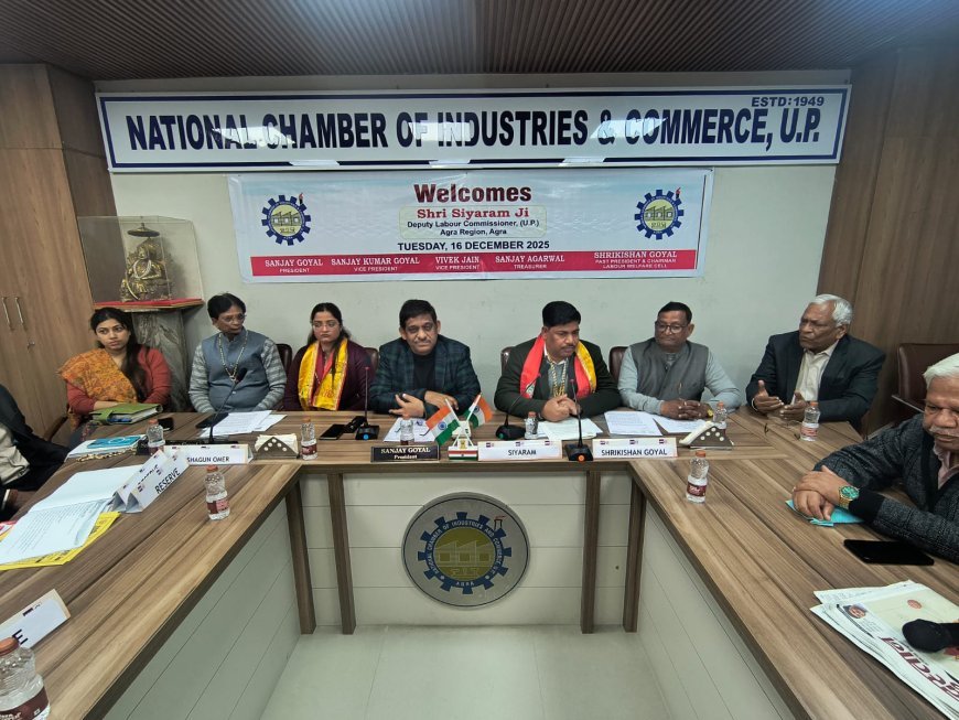 आगरा: नेशनल चैंबर ऑफ कॉमर्स एंड इंडस्ट्रीज के सभागार में चैंबर अध्यक्ष संजय गोयल की अध्यक्षता में और पूर्व अध्यक्ष एवं श्रम कल्याण प्रकोष्ठ चेयरमैन श्रीकिशन गोयल के नेतृत्व में उपश्रमायुक्त आगरा मंडल सियाराम सहित श्रम विभाग के वरिष्ठ अधिकारियों के साथ महत्वपूर्ण बैठक हुई। बैठक में श्रम कल्याण प्रकोष्ठ की ओर से 12 सूत्रीय प्रतिवेदन प्रस्तुत किया गया।