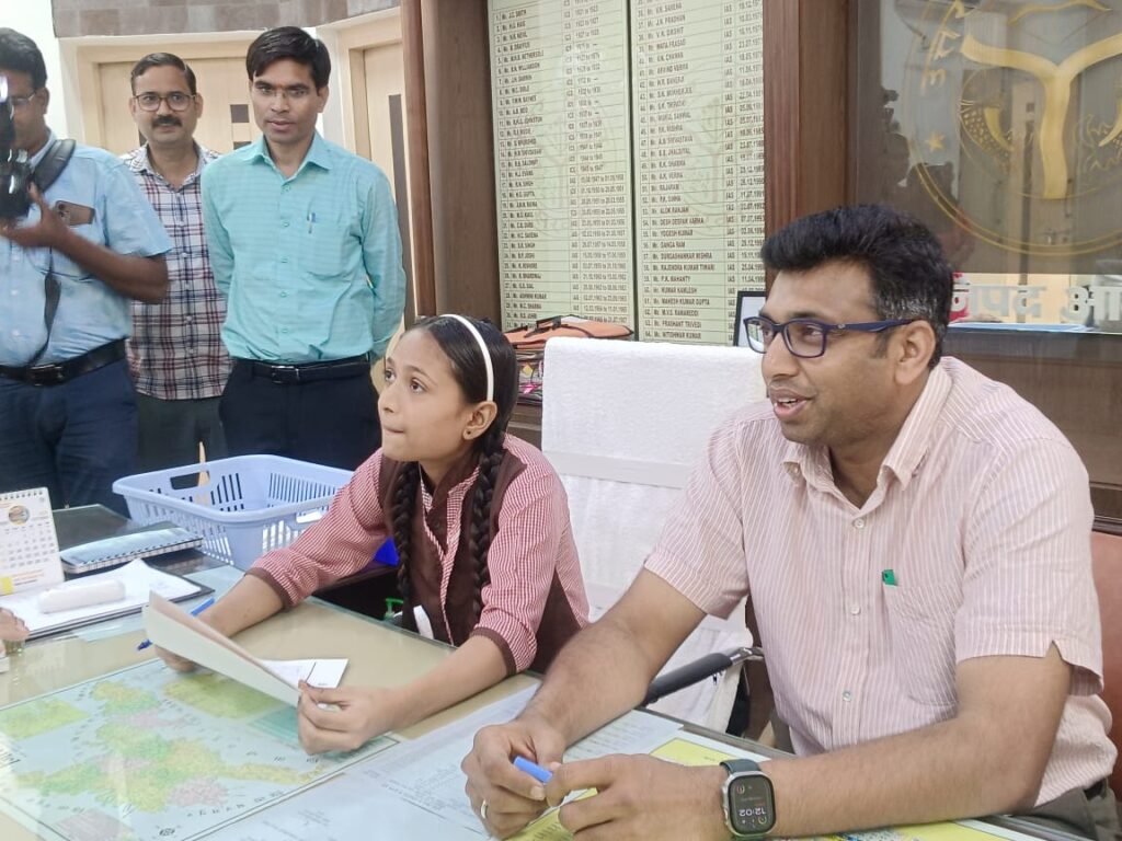 आगरा। शुक्रवार को आगरा के कलेक्ट्रेट में एक अनूठा नजारा देखने को मिला, जब श्यामा देवी कंपोजिट विद्यालय की छात्रा गुलाल ने एक दिन के लिए जिलाधिकारी की कुर्सी संभाली। मिशन शक्ति 5.0 अभियान के तहत गुलाल को यह जिम्मेदारी सौंपी गई थी, और जिस आत्मविश्वास के साथ उन्होंने जनसुनवाई की और निर्देश जारी किए, उसने सभी का दिल जीत लिया।