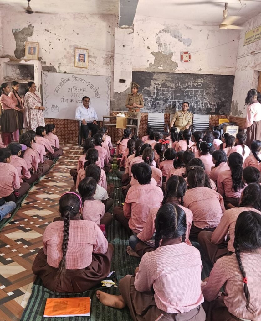 थाना गोवर्धन की टीम ने उच्च प्राथमिक विद्यालय में छात्र-छात्राओं को 1090, 1098, 1930, 181, 108, 1076 जैसे महत्वपूर्ण हेल्पलाइन नंबरों के बारे में बताया और स्कूल के आसपास चेकिंग भी की।