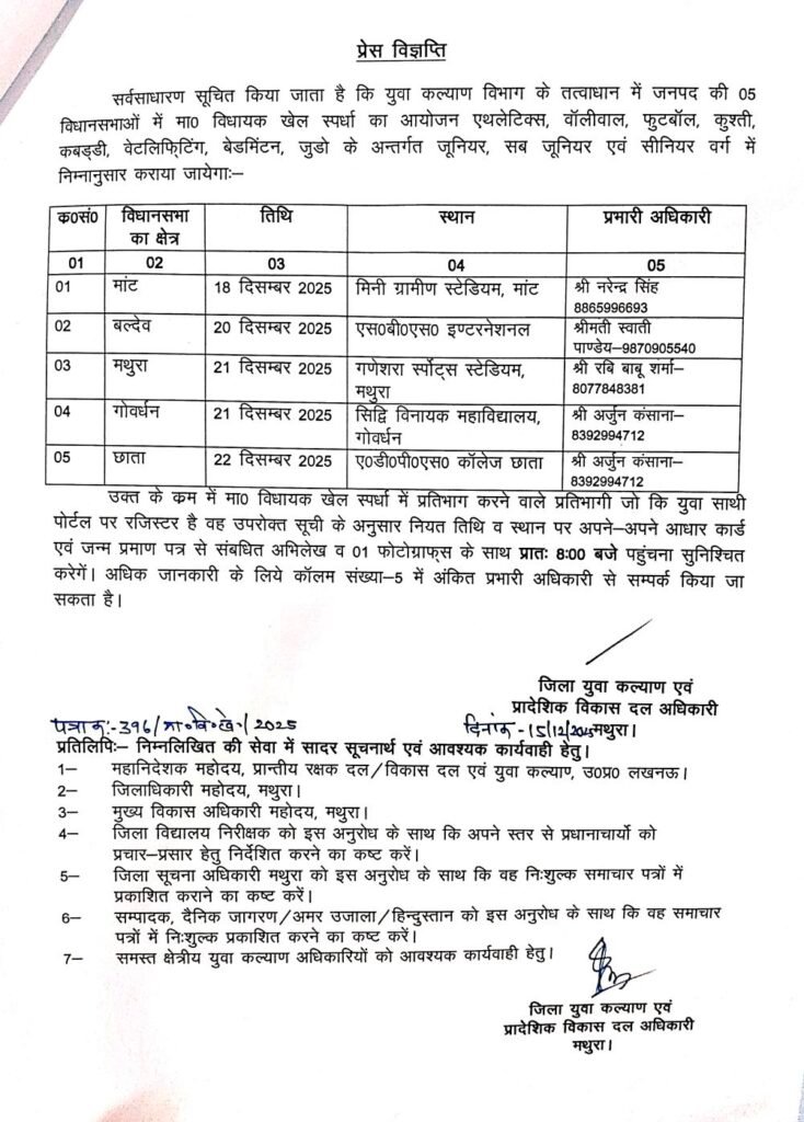 मथुरा। युवा कल्याण एवं प्रादेशिक विकास दल विभाग के तत्वावधान में जनपद मथुरा की पांच विधानसभा क्षेत्रों में मंडल/जनपद स्तरीय विधायक खेल प्रतियोगिताओं का आयोजन 18 से 22 दिसंबर 2025 तक किया जाएगा। प्रतियोगिताओं में एथलेटिक्स, वॉलीबॉल, फुटबॉल, कबड्डी, बैडमिंटन, बैडमिंटन युगल, जूडो, वेटलिफ्टिंग सहित अन्य खेलों के मुकाबले कराए जाएंगे।