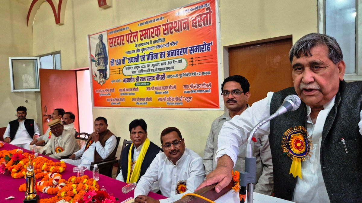 बस्ती । लौह पुरूष सरदार बल्लभ भाई पटेल के 150 वीं जयन्ती पर शुक्रवार को सरदार पटेल स्मारक संस्थान परिसर में सांसद राम प्रसाद चौधरी ने पटेल जी की प्रतिमा का लोकापर्ण किया। इसके बाद छत्रपति साहू जी सभागार में गोष्ठी का आयोजन किया गया। मुख्य अतिथि के रूप में गोष्ठी को सम्बोधित करते हुये पूर्व कैबिनेट मंत्री सांसद राम प्रसाद चौधरी ने कहा कि किसान के बेटे के रूप में पटेल जी ने उच्च शिक्षा प्राप्त करने के बावजूद अपनी सुविधा की जगह देश के हितों को महत्व दिया। ऐसे महापुरूष विरले होते हैं जो संकट में बहादुरी का परिचय देते हुये विजेता बनकर उभरे। उन्होने 562 रियासतों को एकता के सूत्र में बांध कर भारत के स्वरूप को सशक्त बनाया। कहा कि देश को आजाद कराने से लेकर गृह मंत्री के रूप में देश के निर्माण में उनके योगदान से युवाओं को प्रेरणा लेना चाहिये।