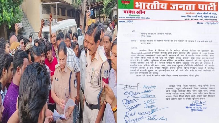 मुरैना/मप्र। ग्वालियर में भगवती शुक्ला नामक व्यक्ति द्वारा सोशल मीडिया पर पैगंबर हजरत मुहम्मद (स.अ.व.) के खिलाफ की गई अभद्र टिप्पणी से मुस्लिम समुदाय में भारी आक्रोश व्याप्त है। इस टिप्पणी के विरोध में मुरैना के भाजपा अल्पसंख्यक मोर्चा अध्यक्ष परवेज खान के नेतृत्व में मुस्लिम समुदाय ने शहर के विभिन्न थानों में ज्ञापन सौंपकर कड़ी कार्रवाई की मांग की है।