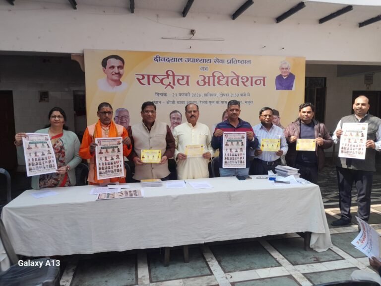 मथुरा।पंडित दीनदयाल उपाध्याय के प्रेरणादायी विचारों और सेवा कार्यों को आगे बढ़ाने के उद्देश्य से स्थापित दीनदयाल उपाध्याय सेवा प्रतिष्ठान का दो दिवसीय राष्ट्रीय अधिवेशन 21 और 22 फरवरी 2026 को मथुरा में आयोजित किया जाएगा। प्रतिष्ठान की स्थापना पूर्व प्रधानमंत्री अटल बिहारी वाजपेयी के निर्देशन में की गई थी।कार्यक्रम संयोजकों रासबिहारी अग्रवाल, अजय कुमार अग्रवाल, सुभाष सैनी, मदनमोहन राजपूत, बाबूलाल सैनी, सौरभ अग्रवाल, पंकज सिंघल, नरेंद्र गौतम, डॉ. रश्मि अग्रवाल, आशीष बब्बू एवं यशपाल सिंह ने बताया कि अधिवेशन का शुभारंभ 21 फरवरी को दोपहर 2:30 बजे श्रीजी बाबा आश्रम (भूतेश्वर) में होगा।अधिवेशन में विभिन्न जिलों से लगभग 250 प्रतिनिधि भाग लेंगे। कार्यक्रम के अंतर्गत चार चरणों में बैठकें आयोजित की जाएंगी, जिनमें संगठन विस्तार, सेवा कार्यों की समीक्षा और भविष्य की कार्ययोजना पर मंथन होगा।