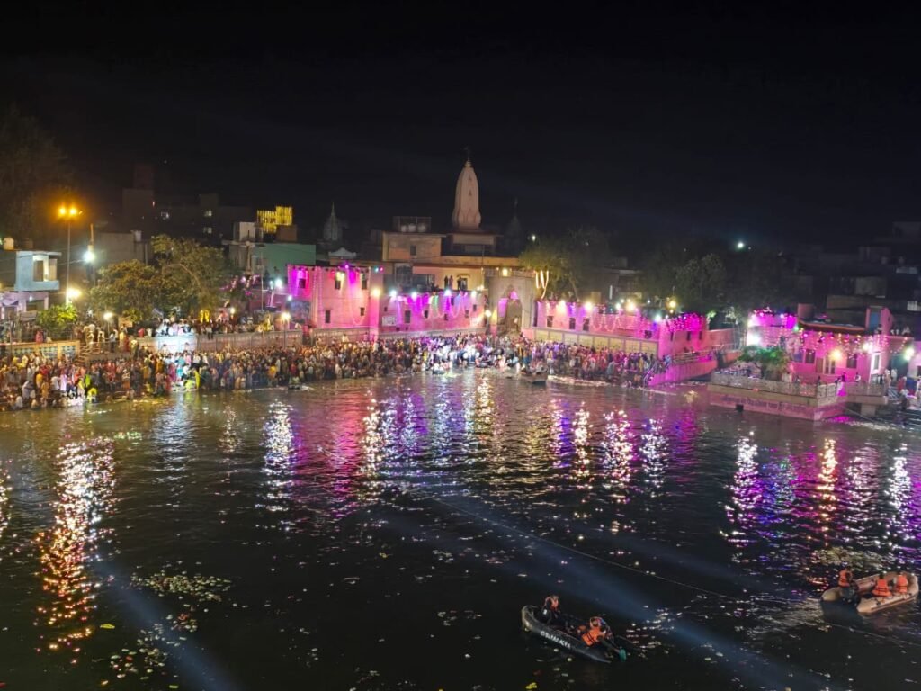 अहोई अष्टमी की रात्रि में राधाकुंड का दृश्य अद्भुत था — जल में दीपों की झिलमिलाहट, श्रद्धालुओं का विश्वास और राधारानी की जयकारों से सम्पूर्ण वातावरण भक्ति रस में डूबा रहा।