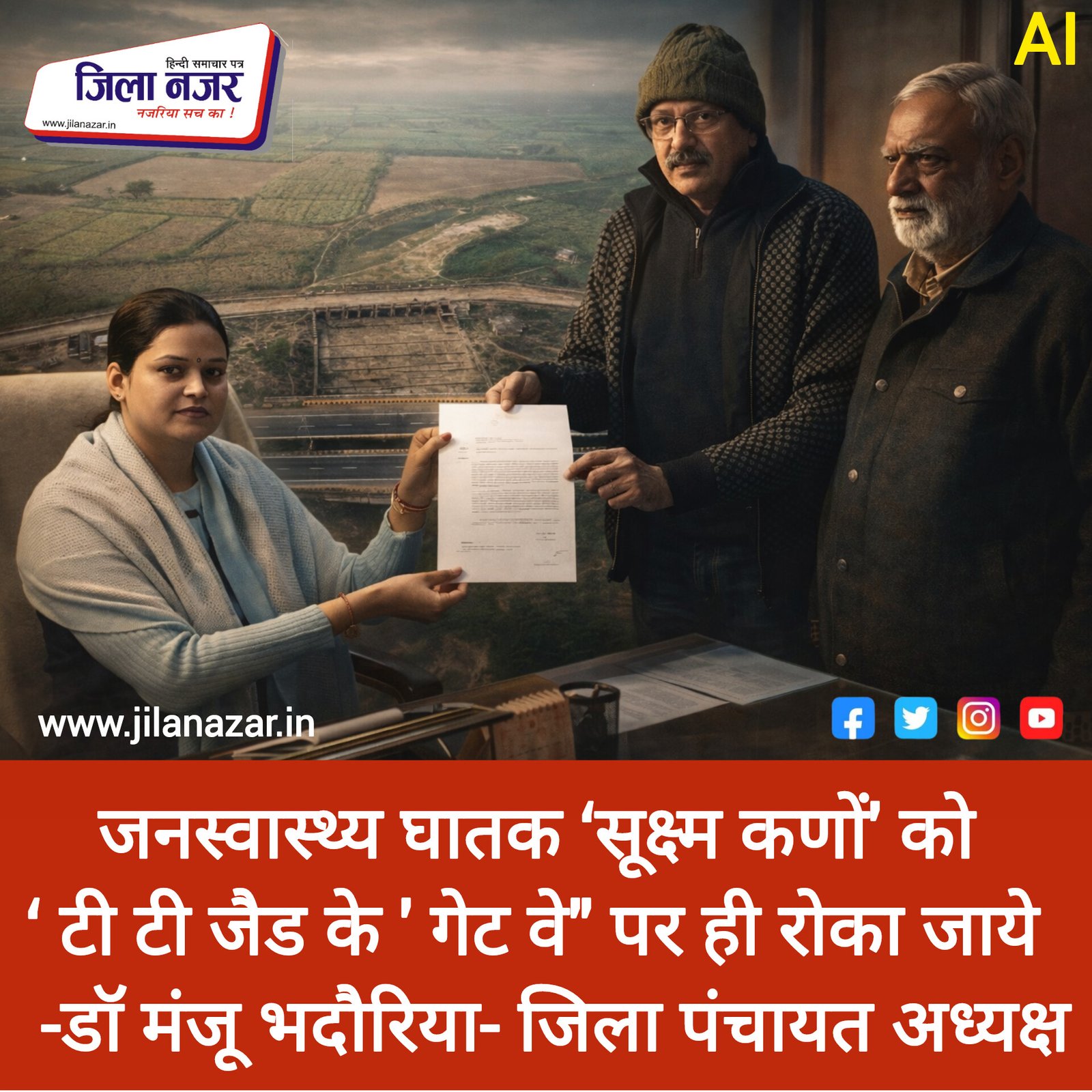 सिविल सोसायटी आफ आगरा के प्रतिनिधियों से अपने कैंप आफिस पर चर्चा करते हुए कहा कि प्रदेश के सिंचाई एवं जल संसाधन मंत्री स्वतंत्र देव को उन्होंने पत्र लिख कर तेरह मोरी बांध की मरम्मत करवाने को लिखा है,जबकि ताज ट्रिपेजियम जोन अथॉरिटी के अध्यक्ष (मंडलायुक्त आगरा) से भी आवश्यक कदम उठाए जाने को निर्देशित करने का आग्रह किया है। 3 फरवरी 2026 लिखे पत्र में जिला पंचायत अध्यक्ष ने कहा है कि जनस्वास्थ्य घातक सूक्ष्म कण (μg/m³ )राजस्थान की ओर से आने वाली धूल भरी तेज हवाओं के साथ आते हैं और ताजमहल ही नहीं फतेहपुर सीकरी,अछनेरा और अकोला विकासखंड में जन स्वास्थ्य के लिए घातक साबित हो रहे हैं।