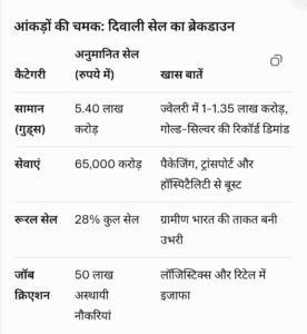 नई दिल्ली/एजेंसी: इस दिवाली पर भारत ने न सिर्फ आर्थिक पटाखे फोड़े, बल्कि आत्मनिर्भर भारत के संकल्प को भी चमकाया। कन्फेडरेशन ऑफ ऑल इंडिया ट्रेडर्स (CAIT) की रिपोर्ट के मुताबिक, इस साल दिवाली सेल ने रिकॉर्ड 6.05 लाख करोड़ रुपये का कारोबार किया, जो पिछले साल के 4.25 लाख करोड़ से 25% ज्यादा है। इसमें 5.40 लाख करोड़ रुपये का सामान बिका, तो 65,000 करोड़ रुपये की सेवाओं (जैसे लॉजिस्टिक्स, पैकेजिंग और डिलीवरी) ने भी इकोनॉमी को बूस्ट दिया। ग्रामीण और अर्ध-शहरी इलाकों से 28% सेल आई, जो बताता है कि खुशहाली अब सिर्फ शहरों तक सीमित नहीं।