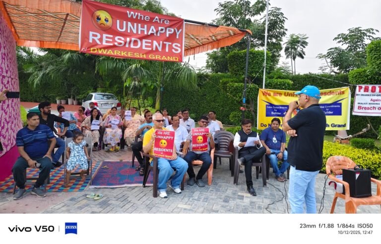 धरने के दौरान बिल्डर निखिल अग्रवाल भी मौके पर नहीं पहुंचे। इस दौरान निवासियों ने उनसे बिजली, पानी और क्लब हाउस उपयोग शुल्क सहित अन्य मुद्दों पर चर्चा की और त्वरित समाधान की मांग की।