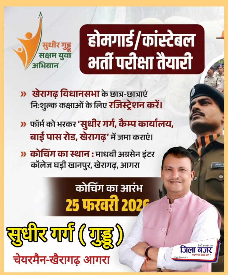 खेरागढ़/आगरा। खेरागढ़ विधानसभा क्षेत्र के युवाओं के लिए एक सुनहरा अवसर! आर्थिक तंगी से जूझ रहे प्रतिभाशाली युवाओं को अब महंगी कोचिंग की चिंता किए बिना पुलिस और होमगार्ड भर्ती परीक्षाओं की तैयारी करने का मौका मिलेगा। सुधीर गर्ग ‘गुड्डू’ द्वारा शुरू किए गए ‘सक्षम युवा अभियान’ के तहत निःशुल्क कोचिंग कक्षाओं का शुभारंभ होने जा रहा है। यह पहल न केवल युवाओं की आर्थिक बाधाओं को दूर करेगी, बल्कि क्षेत्रीय स्तर पर रोजगार के नए द्वार भी खोलेगी।