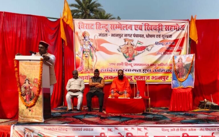बस्ती। भानपुर बाजार के सब्जी मंडी में संघ शताब्दी वर्ष के अन्तर्गत तृतीय चरण का कार्यक्रम एक भव्य हिंदू सम्मेलन आयोजित किया गया । सम्मेलन का मुख्य उद्देश्य समाज में सनातन संस्कृति, धर्म और राष्ट्रीय चेतना को मजबूत करना था। डुमरियागंज, इटवा बांसी और आसपास के क्षेत्रों से बड़ी संख्या में लोगों ने भाग लिया।