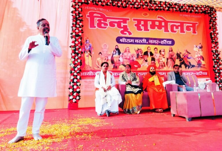बस्ती। हिन्दू समाज की बंधुता, परस्पर प्रेम, सहयोग तथा स्वाभिमान हेतु विराट हिंदू सम्मेलन का आयोजन हर्रैया के बीआर इण्टर कॉलेज के परिसर में शनिवार को किया गया। सम्मेलन के मुख्य वक्ता राष्ट्रीय स्वयंसेवक संघ के अखिल भारतीय सह सेवा प्रमुख सेंथिल ने कहा कि हमारे देश में शौर्य, ज्ञान, संपत्ति किसी चीज की कमी नहीं थी। बाहर से आए लोगों ने इस देश को खूब लूटा। गुलामी का सबसे बड़ा कारण हम सभी का संगठित ना होना था। हिंदू समाज की एकजुटता से ही समाज में परिवर्तन संभव है इसलिए देश के उत्थान के लिए पूरे हिंदू समाज को एकजुट होना जरूरी है। उन्होंने सामाजिक समरसता, पर्यावरण संरक्षण, स्वदेशी अपनाने, कुटुंब प्रबोधन और नागरिक कर्तव्य जैसे पांच प्रमुख बिंदुओं पर विस्तार से लोगों को बताया। कहा कि पंच परिवर्तन व्यक्ति से समाज तक सकारात्मक बदलाव का रास्ता प्रशस्त करता है। पंच परिवर्तन से ही गौरवशाली राष्ट्र का निर्माण होगा। कार्यक्रम की अध्यक्षता कर रहे डॉ दीनानाथ पटेल ने कहा कि इस पूरे विश्व का कल्याण केवल सनातन धर्म ही कर सकता है क्योंकि सनातन धर्म सार्वभौमिक सिद्धांतों वसुधैव कुटुम्बकम् और सर्वे भवन्तु सुखिनः पर आधारित है, जो मानवता के कल्याण और सद्भाव के लिए एक शाश्वत मार्ग प्रदान करता है। कहा कि भारत पुनः विश्व गुरु बनने की दिशा में आगे बढ़ चुका है और यह इसके योग्य भी है।