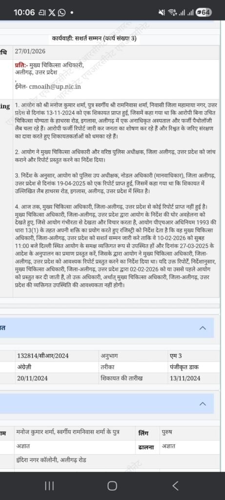 अलीगढ़ में स्वास्थ्य सेवाओं की साख पर एक बार फिर बड़ा सवाल खड़ा हो गया है। इंडियन ह्यूमन राइट्स एंड सोशल जस्टिस कमीशन ने जिले में कथित रूप से फर्जी पैथोलॉजी रिपोर्ट जारी करने और बिना वैध योग्यता के लैब संचालन के गंभीर मामले में मुख्य चिकित्सा अधिकारी (CMO), अलीगढ़ को सशर्त समन जारी किया है।
