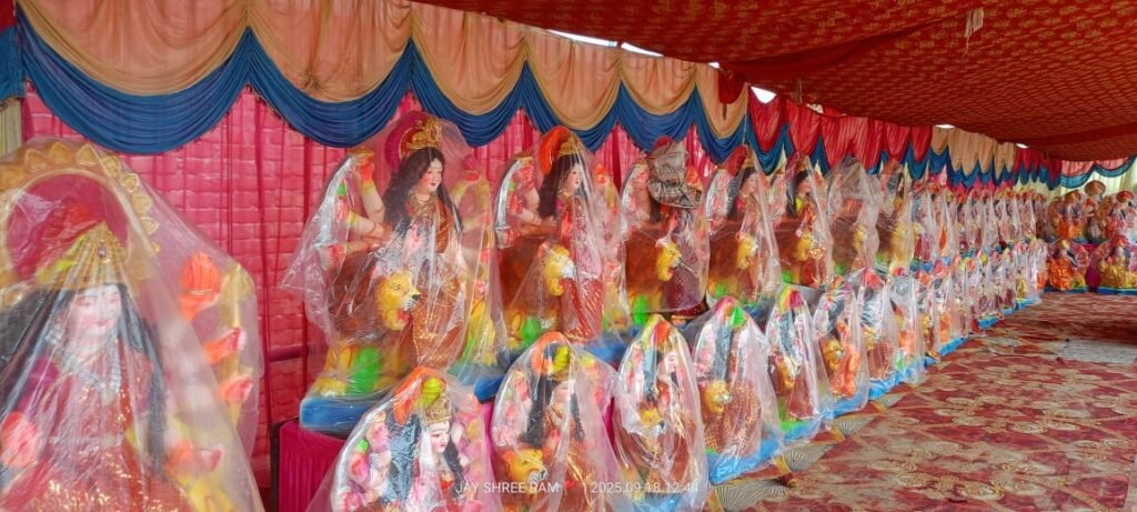 शारदीय नवरात्र सोमवार से प्रारंभ होने जा रहे हैं मां भक्तों द्वारा शारदीय नवरात्र पर बड़े-बड़े पंडालो और घर-घर में मां की प्रतिमा स्थापित कर मां की आराधना करेंगे कस्बे के बाजारों में दुर्गा प्रतिमा विक्रेताओं द्वारा पर्यावरण स्वच्छता का ध्यान रखते हुए मिट्टी और इको फ्रेंडली की एक फूट से लेकर 7 फूटा तक दुर्गा की मूर्तियां बेची जा रही है वहीं मां भक्तों द्वारा भी पर्यावरण स्वच्छता का ध्यान रखते हुए दुर्गा पूजा पंडालो में स्थापित करने के लिए मिट्टी और इको फ्रेंडली प्रतिमा खरीद रहे हैं प्रतिमा विक्रेता सूरज कुमार ने बताया कि दुर्गा प्रतिमा 250 से लेकर₹6000 रुपया तक की बेची जा रही है वहीं भक्तों द्वारा मां के श्रृंगार के समान की खरीदारी भी करते देखे गए।