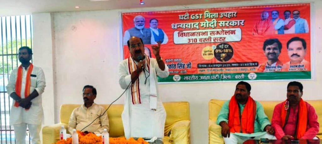 बस्ती। जीएसटी के घटने से उपभोक्ताओं और व्यापरियों दोनों को फायदा हुआ है। त्यौहार के मौसम में प्रधानमंत्री नरेन्द्र मोदी ने देश की जनता को मुंह मीठा करने का अवसर दिया। इससे परिवारांें में जहां खुशियां आ रही हैं वहीं बचत बढने से दोहरा लाभ होगा। यह विचार भारतीय जनता पार्टी के पूर्व जिलाध्यक्ष और ब्लाक प्रमुख यशकान्त सिंह ने मुख्य अतिथि के रूप में व्यक्त किया। वे शनिवार को बस्ती सदर विधानसभा क्षेत्र के नगर पंचायत गनेशपुर में शंकरनगर चौराहे के निकट स्थित दिशा मैरेज हाल के सभागार में आयोजित बस्ती सदर विधानसभा व्यापारी सम्मेलन को सम्बोधित कर रहे थे।