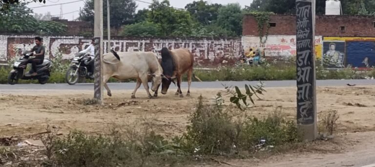 फतेहाबाद/आगरा। फतेहाबाद के बाईपास रोड पर शुक्रवार दोपहर दो आवारा गोवंश आपस में भिड़ गए। इस घटना से सड़क पर अफरा-तफरी मच गई, जिसका एक वीडियो सोशल मीडिया पर वायरल हो रहा है। स्थानीय लोगों ने इन गोवंशों को पकड़कर गौशाला भिजवाने की मांग की है।