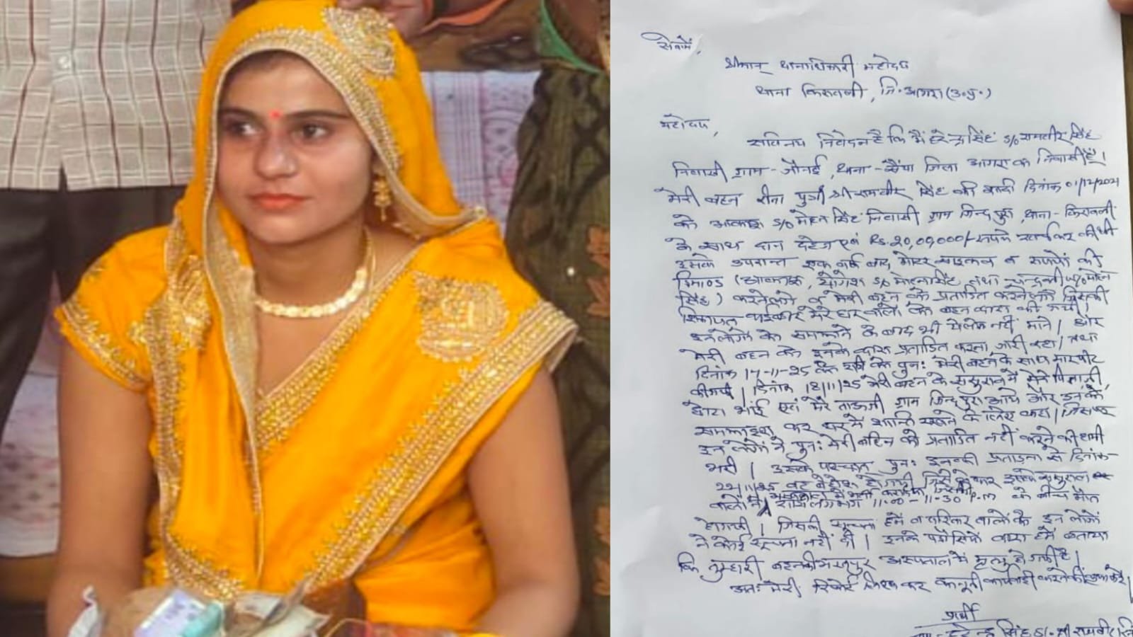 तहरीर के अनुसार हरेंद्र सिंह की बहन रीना की शादी ग्राम घड़ी जिंदपुरा निवासी आकाश पुत्र महेंद्र सिंह के साथ हुई थी। आरोप लगाया गया है कि शादी के बाद से ही रीना को अतिरिक्त दहेज की मांग को लेकर दबाव डाला जा रहा था। मांग पूरी न होने पर उसे मानसिक और शारीरिक रूप से प्रताड़ित किया जाता था।