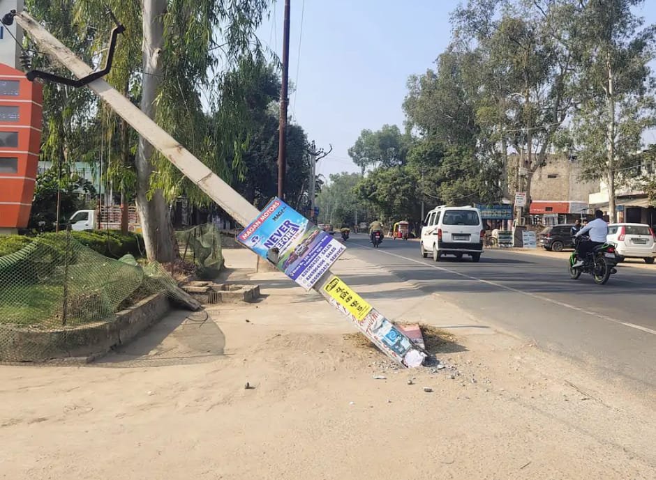 क्षतिग्रस्त विद्युत पोल फतेहाबाद फिलिंग स्टेशन पेट्रोल पंप की ओर झुका हुआ है, जिससे उसके गिरने और किसी बड़ी दुर्घटना होने का खतरा बना हुआ है।