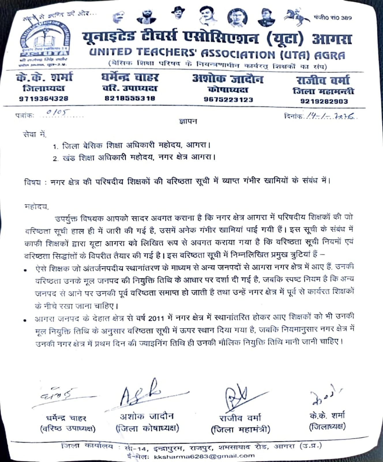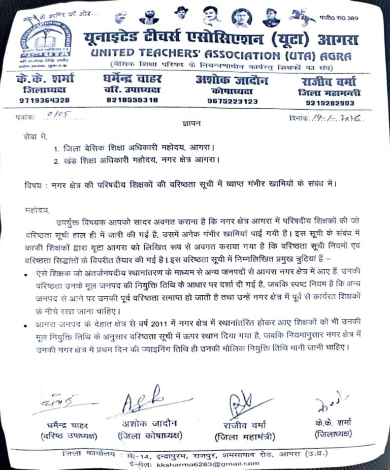 आगरा । यूनाइटेड टीचर्स एसोसिएशन (यूटा), आगरा ने नगर क्षेत्र की परिषदीय शिक्षकों की हाल ही में जारी वरिष्ठता सूची पर गंभीर आपत्ति जताई है। यूटा आगरा के जिला अध्यक्ष के.के. शर्मा एवं जिला महामंत्री राजीव वर्मा ने संयुक्त रूप से कहा कि यह वरिष्ठता सूची नियमों, शासनादेशों एवं वरिष्ठता के स्थापित सिद्धांतों के विरुद्ध तैयार की गई है, जिससे सैकड़ों शिक्षकों के अधिकारों का हनन हुआ है। यूटा जिला महामंत्री राजीव वर्मा ने बताया कि_