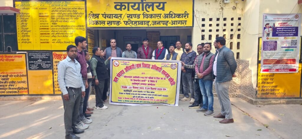 फतेहाबाद/आगरा। फतेहाबाद विकास खंड कार्यालय पर ग्राम विकास अधिकारियों ने ऑनलाइन हाजिरी और अन्य विभागों के अतिरिक्त कार्यों के विरोध में काली पट्टी बांधकर काम किया। यह विरोध प्रदर्शन ग्राम विकास अधिकारी एसोसिएशन उत्तर प्रदेश और ग्राम पंचायत अधिकारी एसोसिएशन उत्तर प्रदेश के आह्वान पर शुरू हुआ है। यह सत्याग्रह आंदोलन 1 दिसंबर से 15 दिसंबर तक चलेगा।