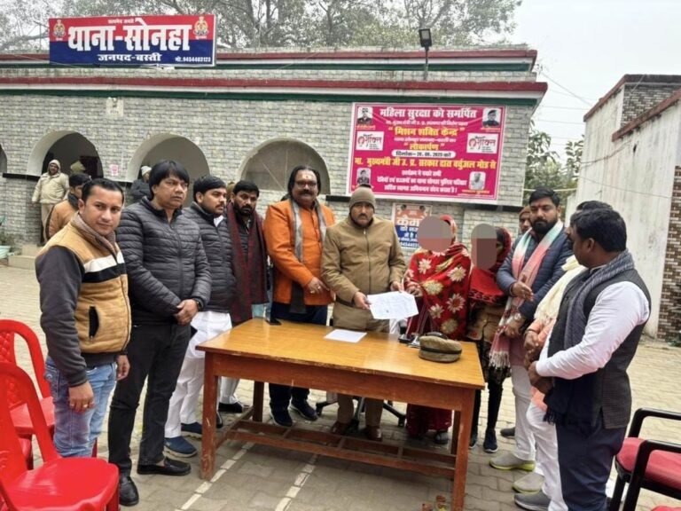 बस्ती। सोनहा थाना क्षेत्र के पिरैला नरहरिया में गांव की निवासी एक महिला और उसकी नाबालिग पुत्री के साथ गांव के मुस्लिम युवक द्वारा अश्लील हरकत और मारपीट का मामला सामने आया है। सूचना मिलने पर बीजेपी टीम 11 सत्येन्द्र सिंह ‘भोलू’, के नेतृत्व में थाने पर पहुँची और पीड़िता को न्याय दिलाने की मांग किया। थानाध्यक्ष महेश सिंह ने टीम 11 को आश्वासन दिया कि प्रकरण में दोषियों के विरूद्ध नियमानुसार कड़ी कार्रवाई की जायेगी।