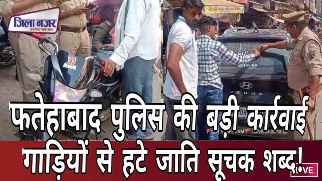 बता दें कि शुक्रवार दोपहर 2:00 बजे कस्बे के अंबेडकर चौक पर उस समय हड़कंप मच गया जब एसीपी अमरदीप लाल के नेतृत्व में इंस्पेक्टर फतेहाबाद धर्मेंद्र कुमार ने भारी पुलिस बल के साथ जाति सूचक शब्द लिखे दोपहिया तथा चार पहिया वाहन वाहनों के खिलाफ कार्रवाई शुरू कर दी। इस दौरान उन्होंने बड़ी संख्या में दो पहिया तथा चार पहिया वाहनों को रोका तथा उनके वाहनों के ऊपर लिखे शब्दों को साफ करवा दिया।